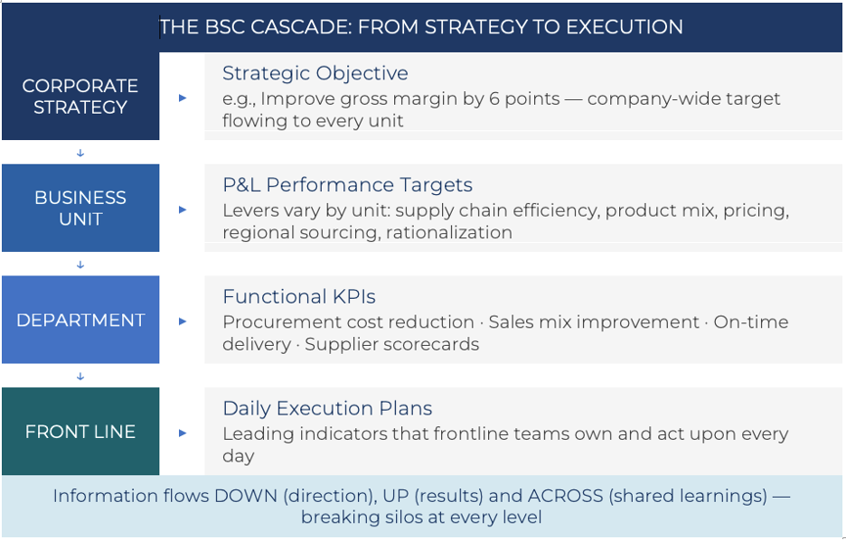 What made the cascading BSC particularly powerful in that environment was that Manitex had established supplier relationships across Europe, the United States, and Asia—yet the regional sourcing teams were not collaborating or sharing intelligence. The horizontal flow of information across business units was the missing element. Once the BSC brought those conversations into a shared framework, the sourcing teams began comparing supplier performance, aligning procurement strategies, and identifying cost reduction opportunities that no single unit could have captured working independently.